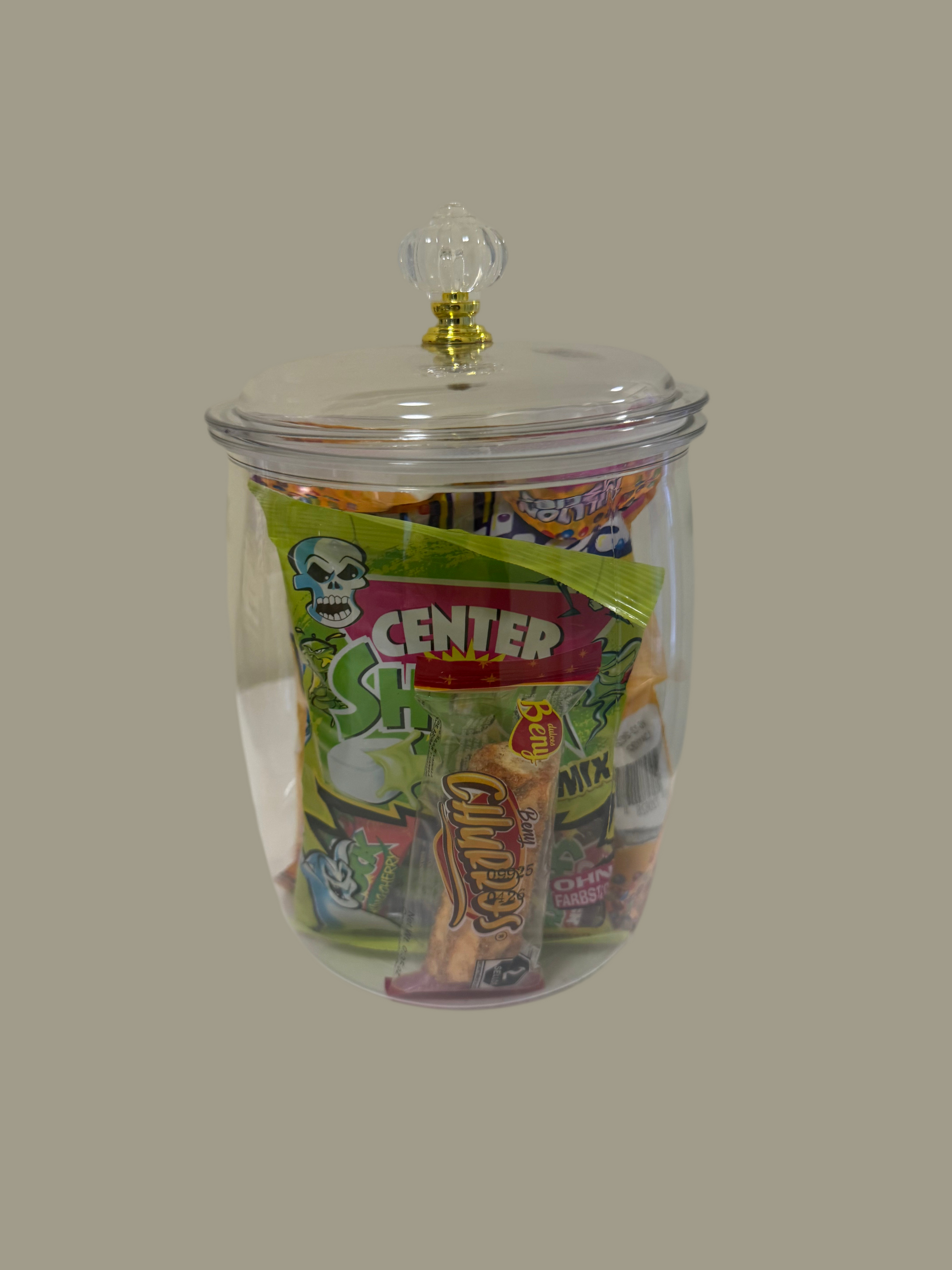 Dieses hochwertige Acrylglas ist gefüllt mit einer kunterbunten Mischung aus Süßigkeiten, die für Abwechslung sorgen – von super sauren Kaubonbons über prickelnde Knallbonbons bis hin zu kultigen Klassikern.